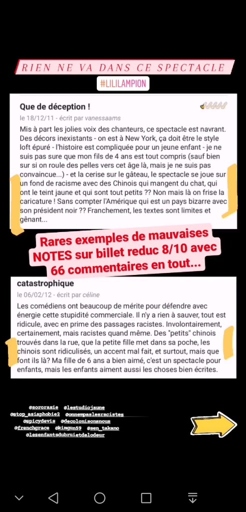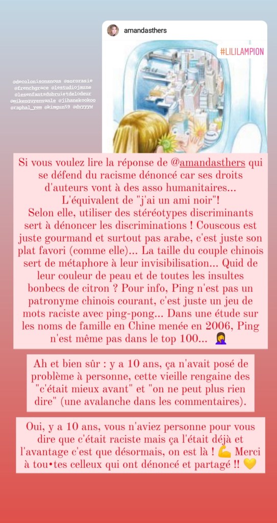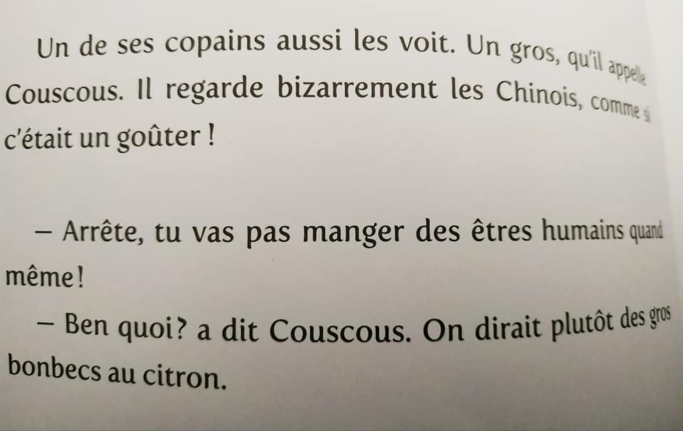 En 2011, Le carnet secret de Lili Lampion de Amanda Sthers chez Nathan est un ramassis d’horreurs. Il faut aussi savoir que Lili Lampion a été adaptée en comédie musicale… avec un super yellow face !! Comment faire autrement avec un tel texte ? Bref, tout y est : la taille, la couleur, l’accent, la nourriture, les insultes… Et big up à Couscous ! Sans que cela soit étonnant, le refus de reconnaissance par l’autrice est vraiment à vomir. Qui se victimise ?
