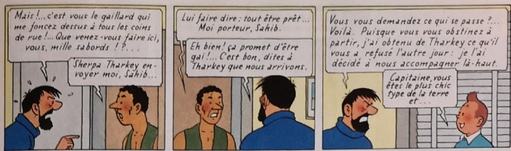Les récits sont majoritairement (pour ne pas dire exclusivement) contés avec un « white gaze », un point de vue blanc, je dirai même plus le point de vue colonisateur. Qui agresse qui quand le capitaine Haddock bouscule un travailleur, s’énerve contre lui en utilisant les termes « vous autres » comme si nous étions tou·tes semblables ? C’est extrêment déshumanisant… Et pourtant, lorsqu’il y a du répondant, « en langue incompréhensible » non traduite, l’agresseur et la victime s’inversent. Lorsqu’il est plus calme, l’étranger parle alors français, mais bien évidemment un mauvais français…