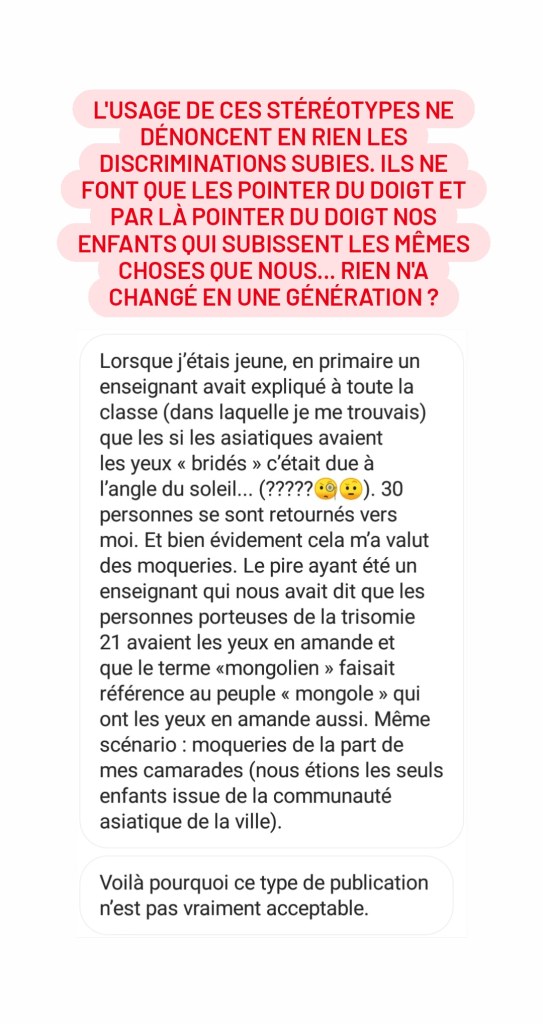 Heureusement, les choses changent et progressivement les Asiatiques prennent leur place, se racontent et racontent leurs histoires. Les représentations changent et c’est pour le mieux. Lorsque vous décidez de parler, décrire, illustrer des personnages asiatiques, renseignez-vous ! Objectif : corriger et mettre fin aux stéréotypes et clichés des représentations uniques, exotiques, fantasmées, racistes et coloniales. L’Asie est composée de 47 pays, vous y trouverez une très grande diversité culturelle et physique !!