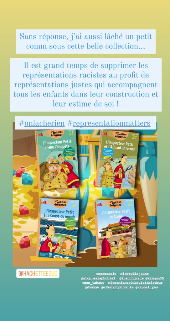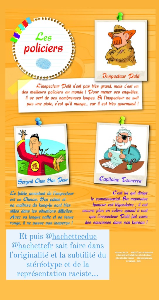 En 2020, Bienvenue à l’école Aimé de Anne Isabelle Le Touzé chez Ecole des loisirs, publie sans scrupule un enfant asiatique de couleur jaune sol… Bon ce n’est pas le seul problème du livre mais c’est une autre histoire.