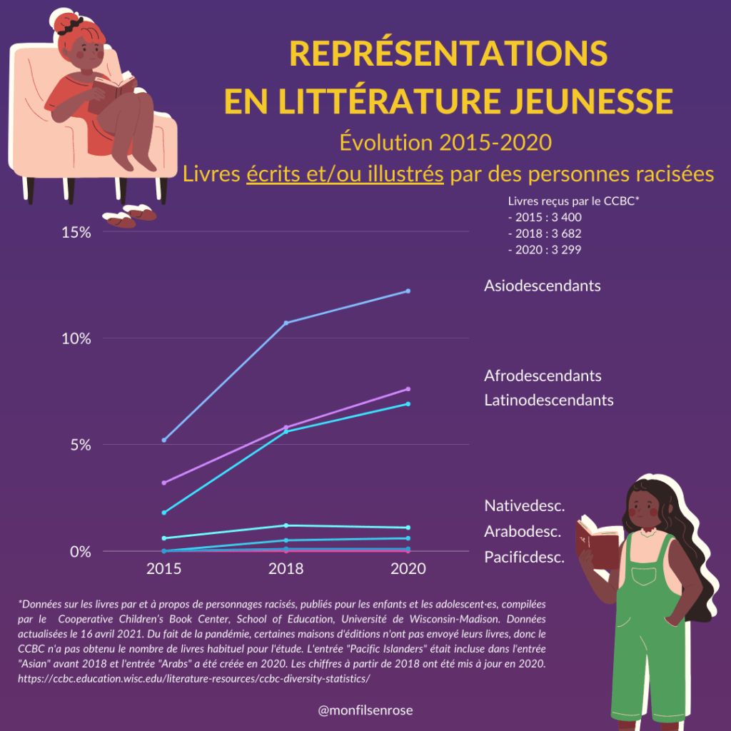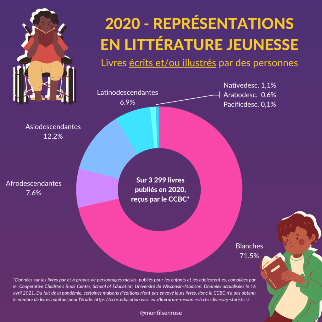 D’après l’étude du Cooperative Children’s Book Center, School of Education, Université de Wisconsin-Madison, sur les 3 299 livres publiés en 2020 reçus, 71,5% ont été écrits ou illustrés par des personnes blanches, contre 12,2% asiodescendantes, 7,6% afrodescendantes, 6,9% latinodescendantes, 1,1% nativedescendantes, 0,6% arabodescendantes et 0,1% pacificdescendantes. Je reprécise ici qu’il s’agit d’une traduction de l’étude dont les statistiques sont en libre accès sur leur site. Également certaines catégories ne sont pas liées à des races sociologiques à proprement parler et l’étude étant réalisée au EUA, elle est liée aux perceptions locales.