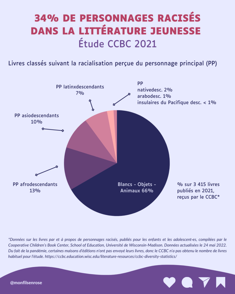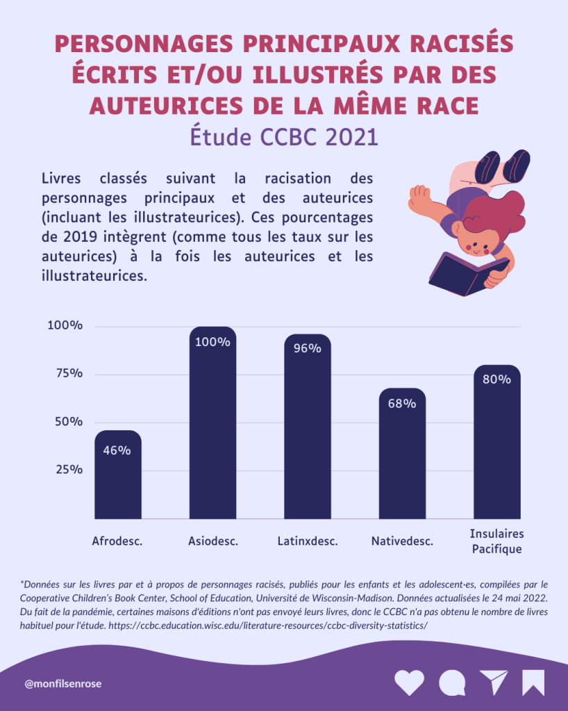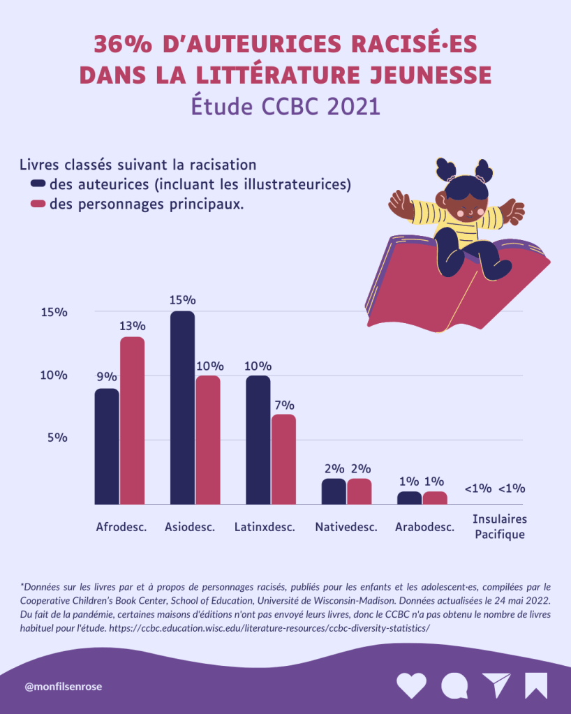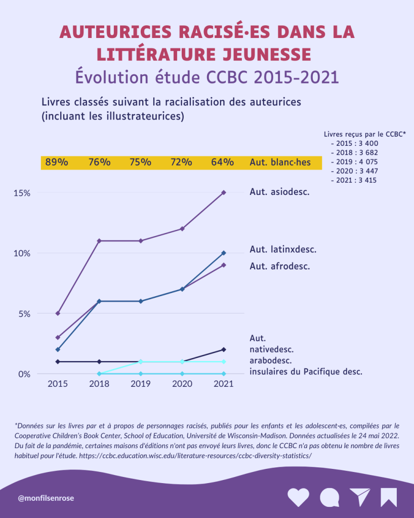 Alors que les personnages principaux afrodescendants représentent 13% de la littérature jeunesse en 2021, les auteurices afrodescendant·es ne représentent que 9%. C’est une tendance qui se maintient donc depuis plusieurs années.