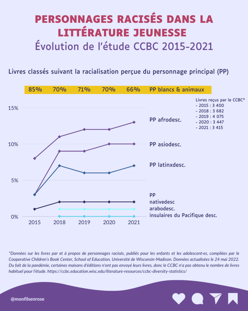 Alors que le taux de personnages principaux blancs et animaux stagnaient à 70% depuis quelques années, il descend à 66% sur les livres publiés en 2021 reçus par le CCBC. On peut penser que cette évolution est liée à la place qu’ont récemment pris les mouvements antiracistes, notamment Black Lives Matter et Stop Asian Hate.