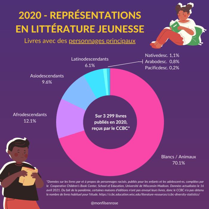 Si on fait un focus sur les personnages racisés, les évolutions sont par voie de conséquence aussi minimes. A cela s'ajoutent deux points d'alerte. Ces statistiques ne tiennent pas comptent ni 1- des stéréotypes et préjugés oppressifs qui pourraient être associés à ces personnages, ni 2- de qui écrit ou illustre ces histoires et personnages...