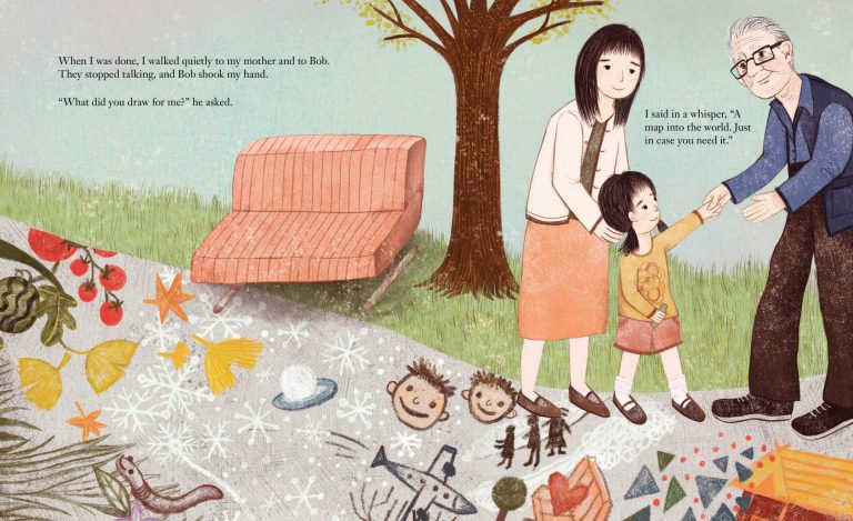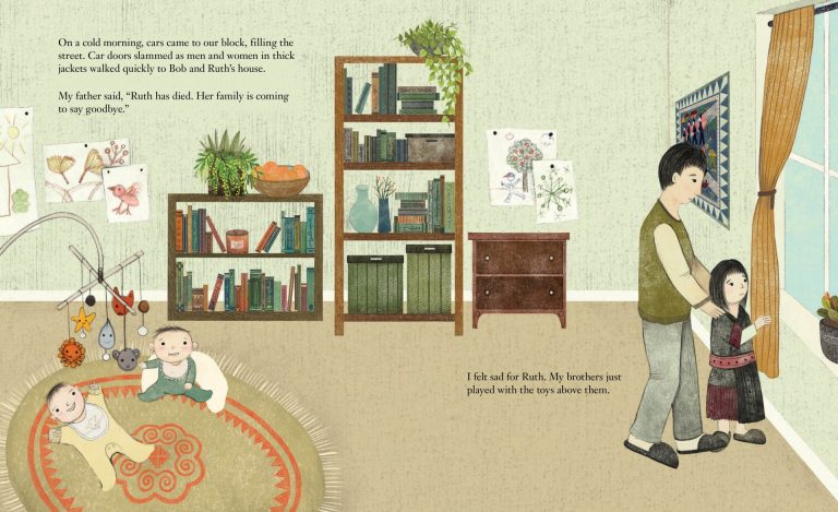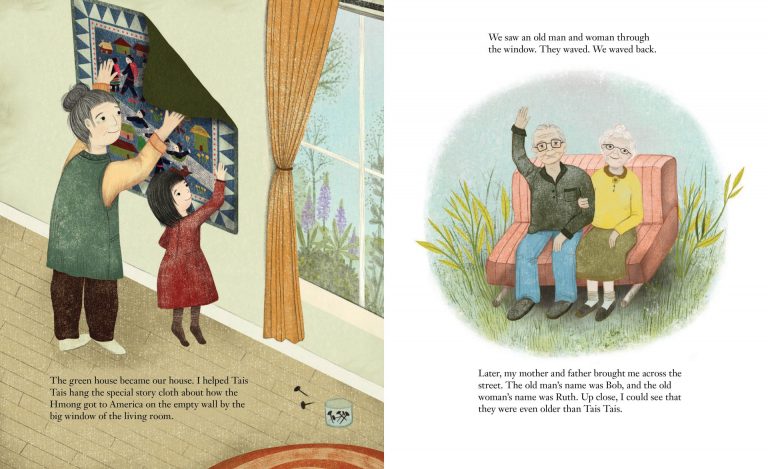 L’album est basé sur l’histoire vraie de l’autrice, une Hmong américaine qui vit avec son mari, leur fille et leurs jumeaux, et qui s’est liée d’amitié avec ses voisins Ruth et Bob. La narration est faite du point de vue de Paj Ntaub et de nombreux détails de l’illustration toute en douceur appuient cette narration. La transmission culturelle Hmong et les liens intergénérationnels en font un must have !
