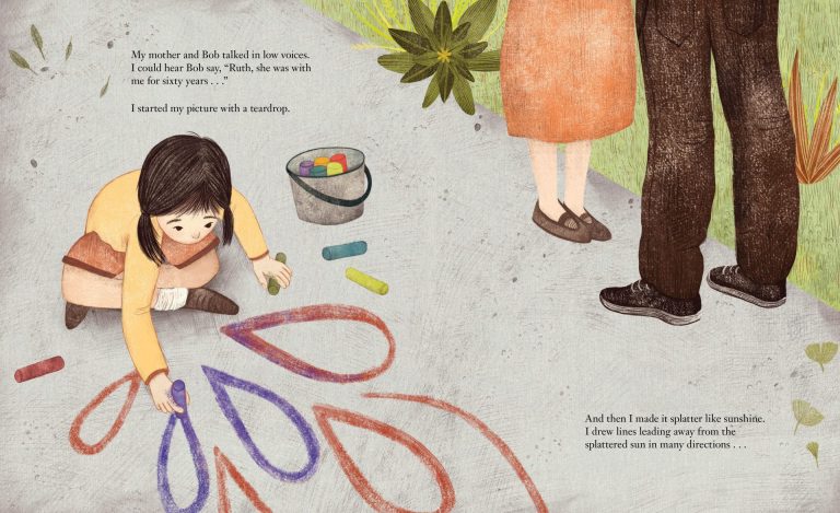 Au fil des saisons, nous découvrons la vie de la famille, l’arrivée dans la grande maison, le lien avec sa grand-mère Tai Tai [Tie Tie], la rencontre avec un couple de voisins Ruth and Bob, la naissance des petits frères, la découverte du froid, le décès de Ruth, les retrouvailles avec le jardin… Avec le printemps, Bob ressort également de chez lui et Paj Ntaub et sa maman viennent lui présenter leurs condoléances. Pendant que maman et Bob discutent, Paj Ntaub dessine à la craie sur le sol…