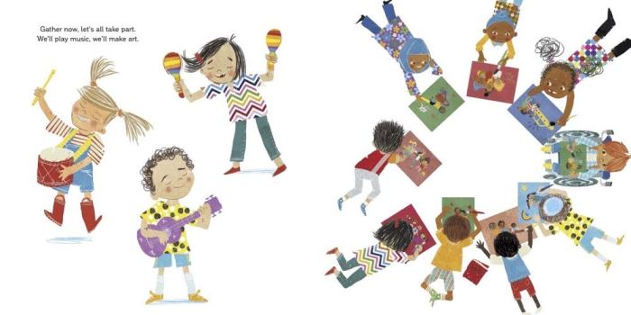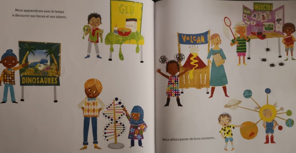 Les illustrations de cet album sont superbes et présentent vraiment un panel hyper riche dans cette classe, que ce soit lié à des origines ethniques, à la pratique d’une religion, à la présence d’un handicap ou encore à la composition de sa famille. Outre certains aspects festifs ou le quotidien, j’adore particulièrement voir tou·tes ces enfants explorer leurs talents notamment scientifiques. Je veux également mettre un gros big up pour lea maitre·sse !