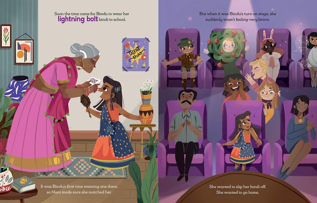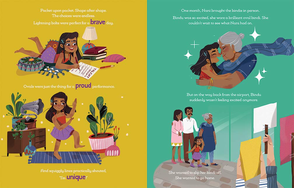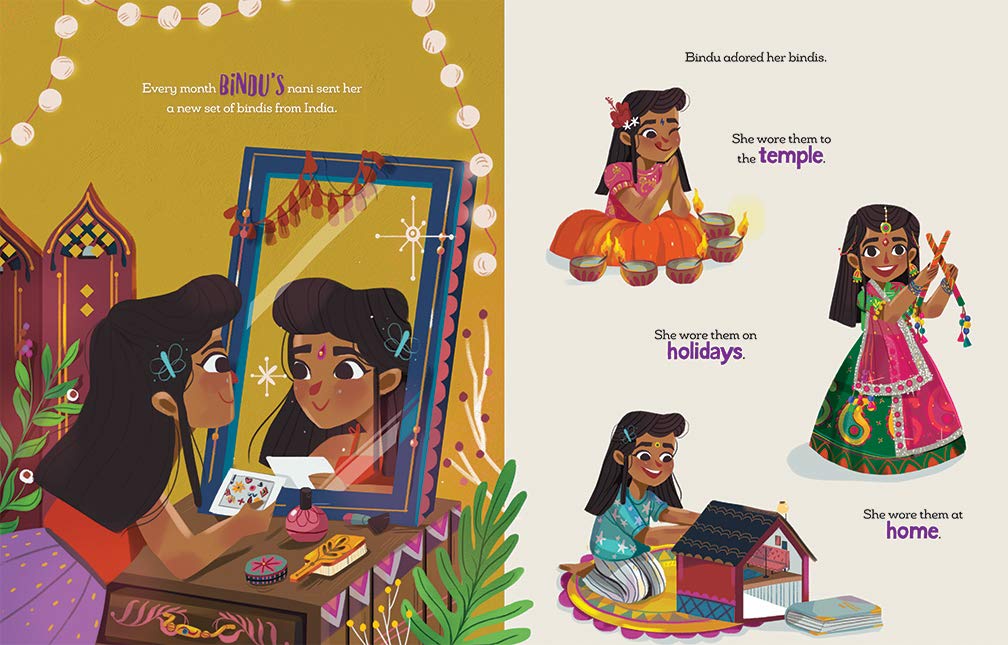Bindu loves her bindis. She wears flowers when she has a silly, giglly day. She wears diamonds on days filled with adventure. And she wears circles when she is feeling festive. She especially loves to match her bindis with her Nani. But when it’s time to wear a bindi to school, Bindu isn’t feeling very brave and adventurous. She wants to slip it off… and she wants to go home.