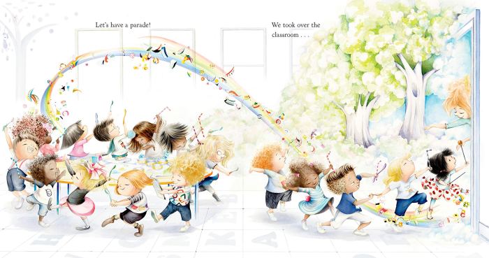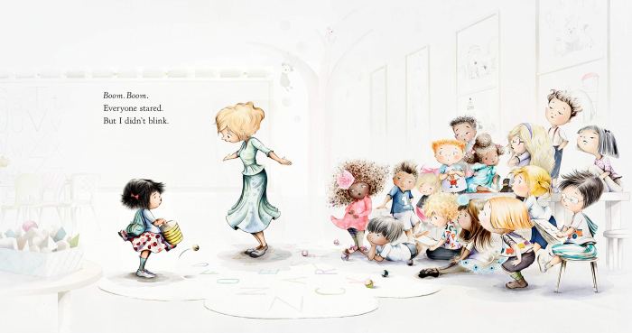 Mais il y a quelque chose de bien plus universel que tout ça ! Danbi commence à tapoter ses baguettes. Suivie par tous les autres enfants, la classe se transforme en véritable boite à musique menant à une parade dans la cour. C’est ainsi que Danbi se fait sa première amie, Nelly, qui va lui montrer comment écrire son nom en lettre toute ronde, et non en belles lignes droites.