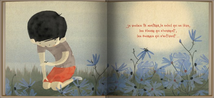 Très poétique, cet album tout en douceur, dévoile petit à petit une relation merveilleuse, ultra complice, d’une maman avec son enfant – qui semble être illustré comme un garçon mais qui n’est jamais genré. La maman dont on ne voit pas le visage pourrait avoir des traits asiatiques, même si ce n’est pas du tout affiché comme tel, les auteurices sont blanc·hes.