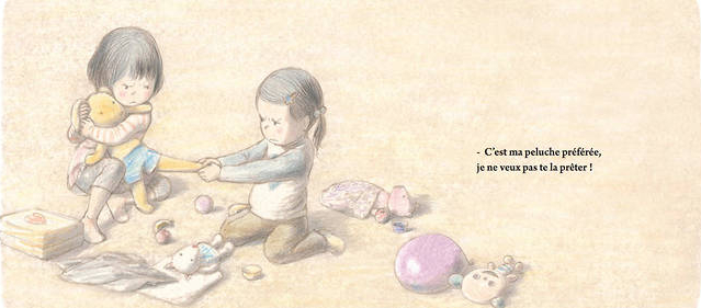 Aussitôt ramené à la maison, aussitôt adopté par Bout’Chou. Quand il s’énerve, il dit maintenant qu’il ne veut « plus jamais » ! Puis en se calmant, nous explique que « plus jamais » c’est peut-être un peu long… C’est un des apprentissages du livre, le temps qui passe…