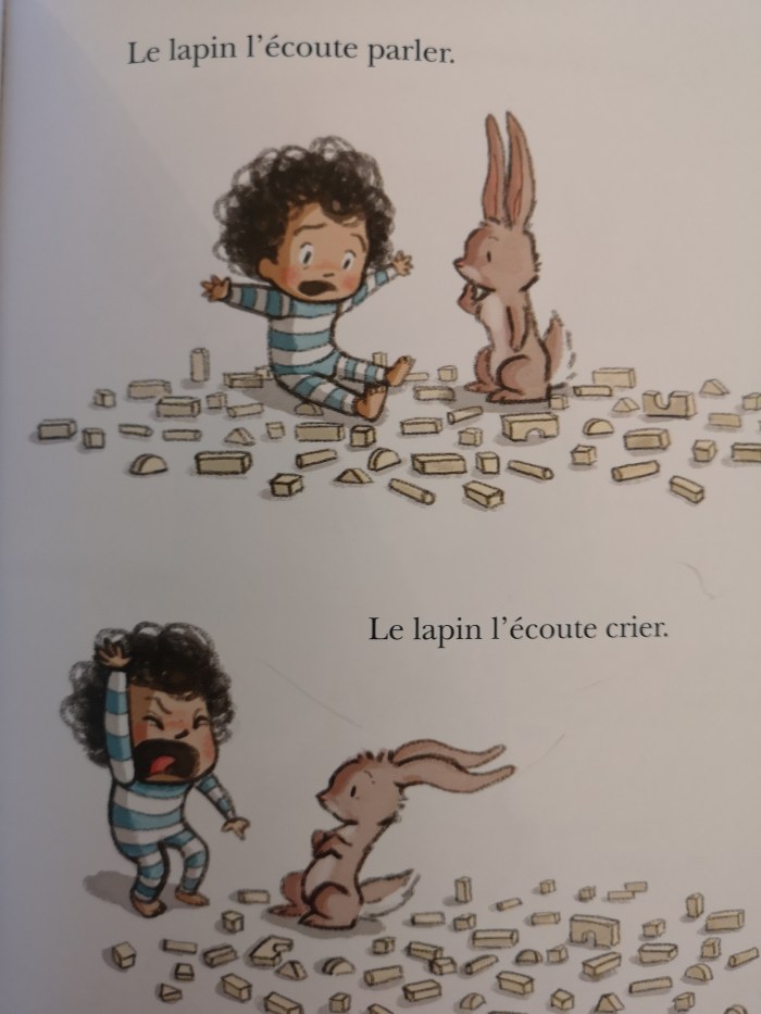 On en a quelques uns des livres sur les émotions mais j’ai toujours l’impression qu’ils vont trop vite. J’y rajoute toujours un peu de temps et d’écoute et c’est tout le sujet de ce tout petit livre qui ravi Bout’Chou.