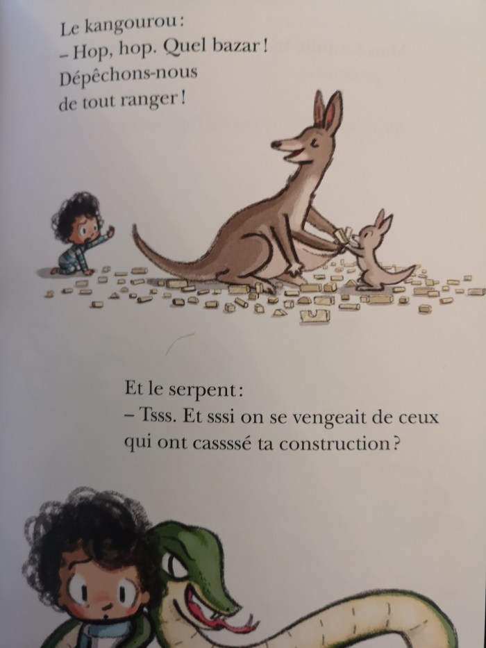 Camille – genré grammaticalement au masculin mais pourrait être une fille – voit s’effondrer le château qu’il avait fièrement construit. Les animaux défilent tous avec une solution pour se remettre vite de ce chagrin profond qui l’accable : parler, crier, se souvenir, rire, faire comme si de rien était, ranger, se venger… Mais Camille n’est pas prêt et malgré leur volonté d’aider, les animaux sont vexés et laissent l’enfant seul.