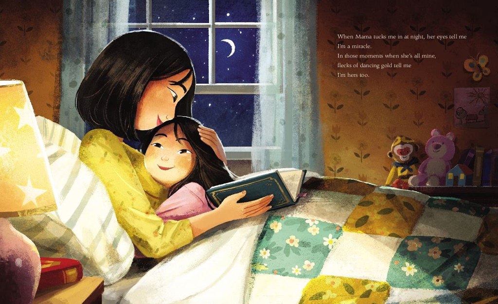 A young Asian girl notices that her eyes look different from her peers’. They have big, round eyes and long lashes. She realizes that her eyes are like her mother’s, her grandmother’s, and her little sister’s. They have eyes that kiss in the corners and glow like warm tea, crinkle into crescent moons, and are filled with stories of the past and hope for the future.