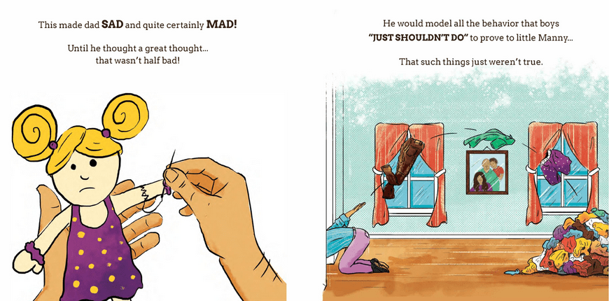 Lors de son premier jour d’école, Manny a appris quelque chose qu’on ne lui avait jamais dit : il y a des choses que les garçons ne devraient pas faire, comme s’habiller « comme une fille » ou jouer avec des poupées. Son père va lui prouver par l’exemple que ce n’est pas vrai ! Vêtus de couleurs vives et des habits de leur choix, ils vont passer du temps à cuisiner, danser, pleurer, essayer tout plein de coiffures…