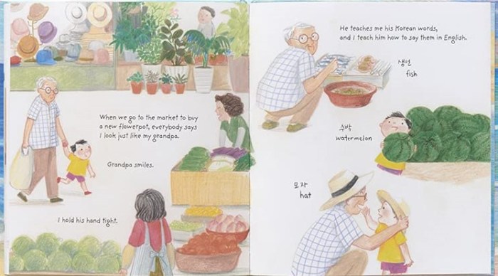 Alors que tout les sépare, la langue, l’âge, et même tout un océan, un enfant et son grand-père trouvent un terrain de jeu qui les liera à jamais. La plume et les illustrations de l’autrice réconcilient une relation intergénérationnelle entre-mêlée d’une histoire de migration. Elle-même née en Corée du Sud et vivant désormais à New York, elle retourne tous les étés chez ses parents avec ses enfants, une manière de maintenir la connexion avec la langue, les odeurs, la nourriture, les traditions…