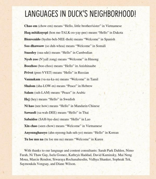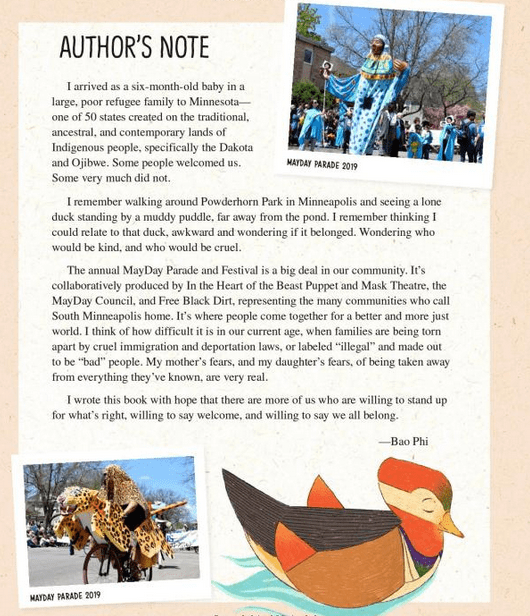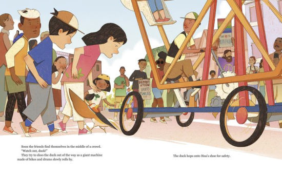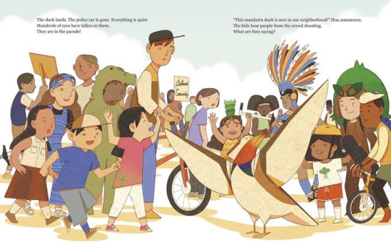 Twins Hue and Hoa are excited for the May Day parade! While waiting at the park for the parade to begin, they spot a little duck who seems new to the neighborhood–and looks confused by the crowd and commotion. How can the twins help the duck get to the pond? Many friends from the neighborhood stop to say hello and offer suggestions. Teamwork, collective brainstorming, and the duck’s own inspiration finally help it reach its new home–with an entire community welcoming it with a parade! A celebration of a vibrant, multicultural neighborhood that warmly welcomes newcomers from near and far, this story also encourages communal problem-solving and offers a gentle reminder of the deportation fears many children and families face.