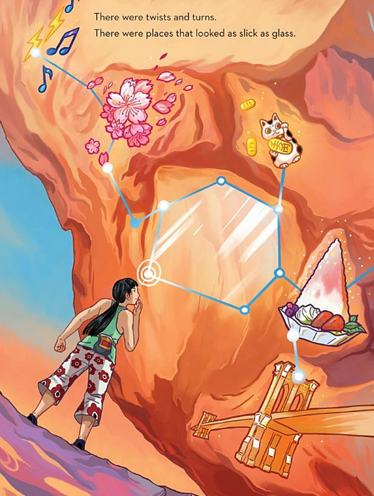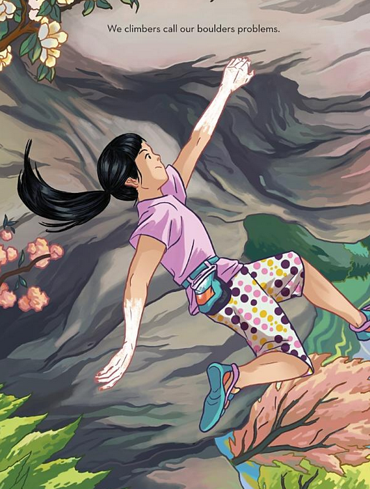 Au cours de l’album magnifiquement illustré, elle présente le cas du « Golden Shadow in Rocklands » (Afrique du Sud), son premier V14 qu’elle a résolu à l’âge de 13 ans… Elle montre sa manière d’analyser le terrain et les liens qu’elle s’imagine avant de tenter de trouver une solution. Par exemple, un élément semble se déboiter comme l’épaule de son père lorsqu’il danse et un autre semble être façonné comme les piles de tissus de l’armoire à couture de sa mère. Cela lui permet de visualiser l’ensemble du problème et de s’y atteler.