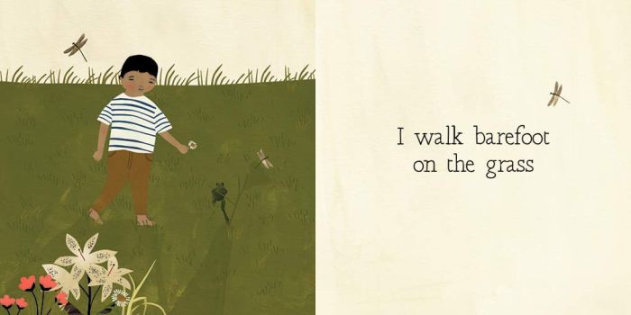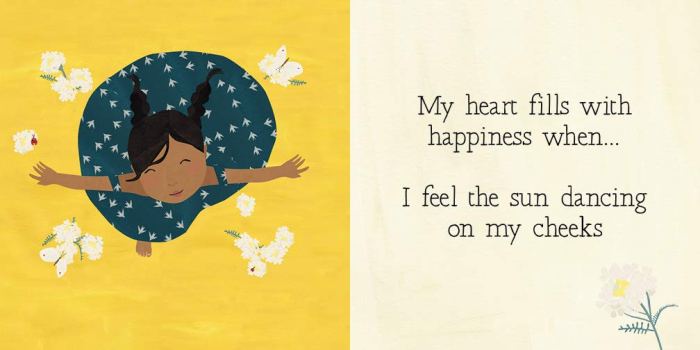 L’album aux illustrations de Julie Flett que j’apprécie beaucoup cite entre autres choses : voir le visage de quelqu’un qu’on aime, sentir la chaleur du soleil qui réchauffe nos joues, marcher pieds nus dans l’herbe, écouter une histoire, jouer du tambour…