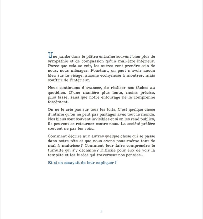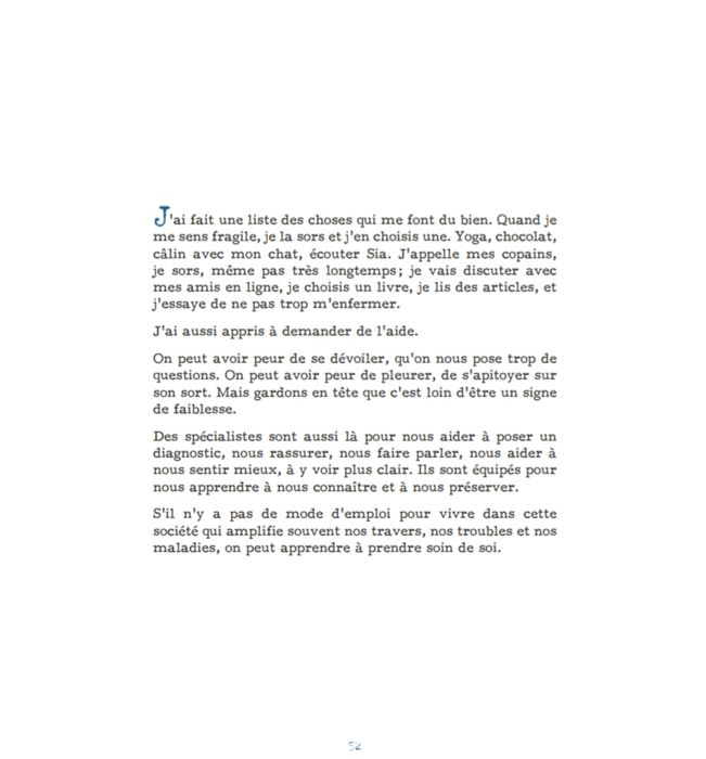 Au fil des pages, nous découvrons Shushanna, Karim, Mélissa, Izna, Anne-Marie, Manu, Jules, Catherine ou encore Axel. A travers une série de témoignages courts, d’un simple paragraphe à un récit d’une page, leurs mots se posent sur leurs maux, ceux qu’on ne voit pas, ceux dont on ne parle pas. Les personnages exposent ce qu’iels ressentent et leur décalage au monde : dépression, trauma, spm, anorexie, boulimie, addiction, hypersensibilité, hypocondrie, anxiété, dissonance…