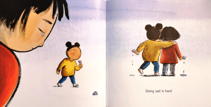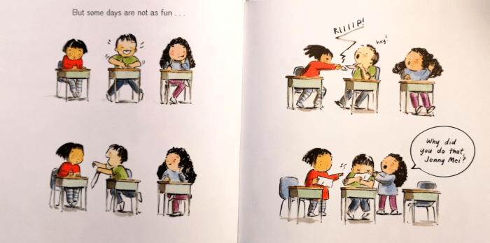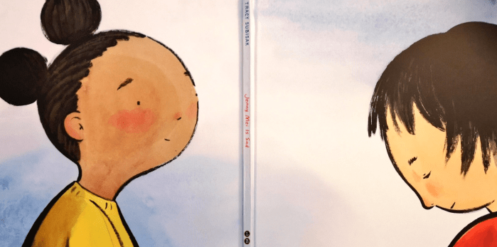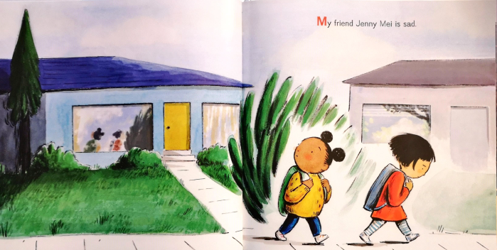 C’est l’histoire d’une jeune enfant dont l’amie est triste. Mais la plupart du temps, à part elle, personne d’autre ne pourrait vraiment le deviner. Jenny Mei continue de sourire, de faire rire les autres. Et parfois, ça dérape… et le mieux à faire quand cela arrive, c’est d’être là et de la soutenir, d’être son amie quand ça va, quand ça ne va pas et tout ce qu’il peut y avoir au milieu.