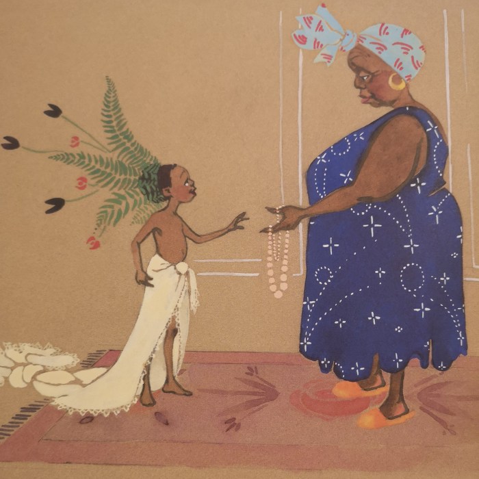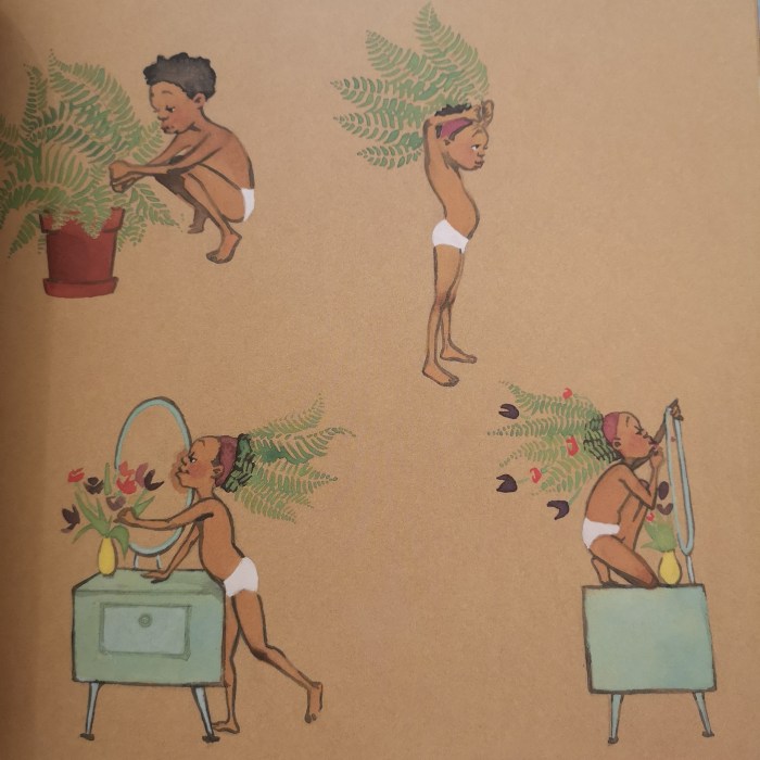 Julian va la piscine avec Nana et ses copines. Il adore l’eau, il adore les sirènes. Il rêve d’en devenir une, ses cheveux longs flottant au gré du mouvement de l’eau, sa queue rose et dorée lui permettant de nager au milieu des poissons multicolores. Nana semble peu réceptive aux déclarations de Julian qui profite de la douche de Nana pour se déguiser en sirène avec quelques plantes, un rideau et surtout le maquillage de Nana… Le bonheur de Julian est juste palpable à travers les illustrations !