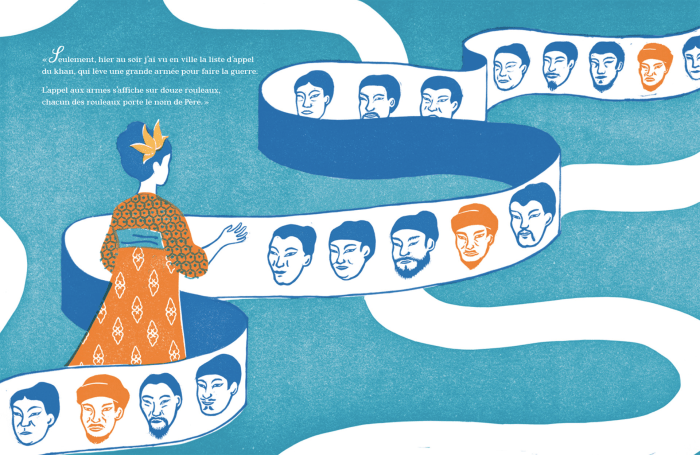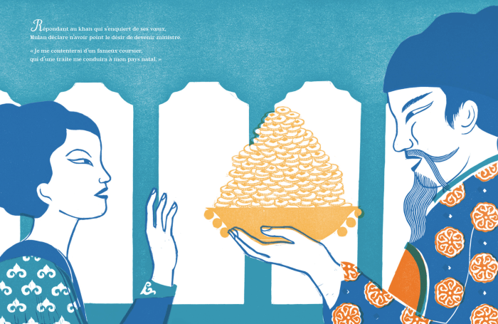 La ballade de Mulan, une légende ancestrale aux tonalités résolument contemporaines… Mulan, apprenant que son père âgé est appelé à la guerre, endosse des habits militaires et part à sa place. Après douze années de combats victorieux et ayant refusé les honneurs du souverain, Mulan rentre au pays auprès des siens. Elle revêt sa robe de jadis et salue ses compagnons d’armes, abasourdis ; ils ne connaissaient jusque-là qu’un vaillant soldat, ils découvrent qu’elle est femme.