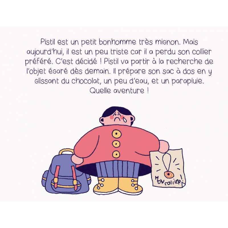 Avec son sac à dos, Pistil part donc à la recherche de son collier, malheureusement perdu. La journée est plus que fatigante à parcourir ces 9 tableaux jusqu’au bout du monde… Finalement, Pistil ne retrouvera pas son collier mais il ne reviendra pas les mains vides et c’est un peu grâce aux lecteurices…