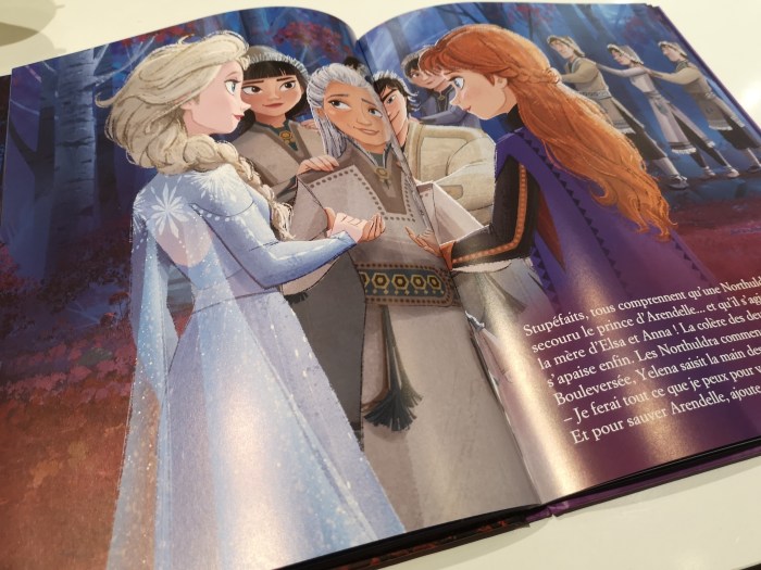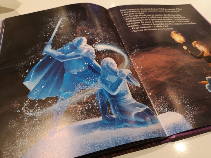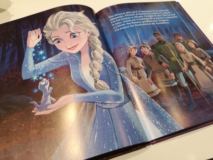 Si vous me suivez, vous le savez, j’ai un grand fan d’Elsa à la maison. Entre deux visionnages, il a fallu prévoir la version papier, tout de même bien longue, à répétition ! Mais cette version (dans sa nouvelle édition dans laquelle la fin n’est pas tronquée) est relativement fidèle au film. Bout’Chou y retrouve ses passages favoris et chante ceux qui manquent.