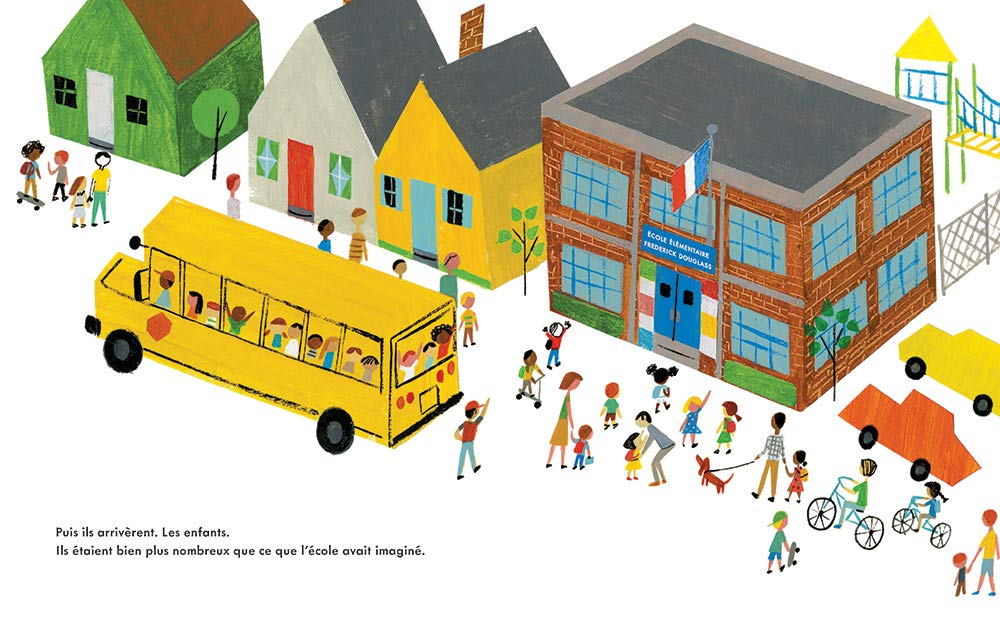 La narratrice de l’album n’est autre que l’école elle-même : l’école élémentaire Frederick Douglass, qui fut un leader noir abolitionniste, réduit en esclavage dès la naissance et ce pendant 20 ans avant de réussir à s’enfuir. L’école vient juste d’être construite et passe ses journées en tête-à-tête avec le concierge qui prend soin d’elle.
