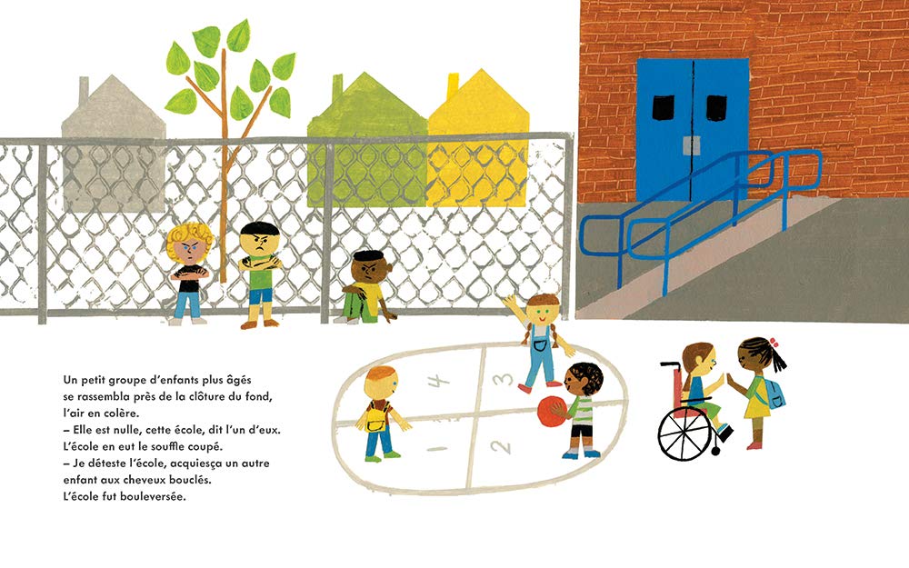 Ici, on aime le changement de perspective pour « se mettre à la place de » avec la personnification enfantine de l’école, le fait que la journée ait ses hauts et ses bas, qu’on puisse se confier à une personne de confiance, et les illustrations de Christian Robinson ! Je n’ai pas encore présenté d’autres albums mais on est vraiment fan ici. Ses illustrations entre dessin et collage fonctionnent parfaitement avec l’univers et proposent une belle diversité dans cette école. Egalement, la carnation de la maitresse est légèrement brunie ce qui est très appréciable.