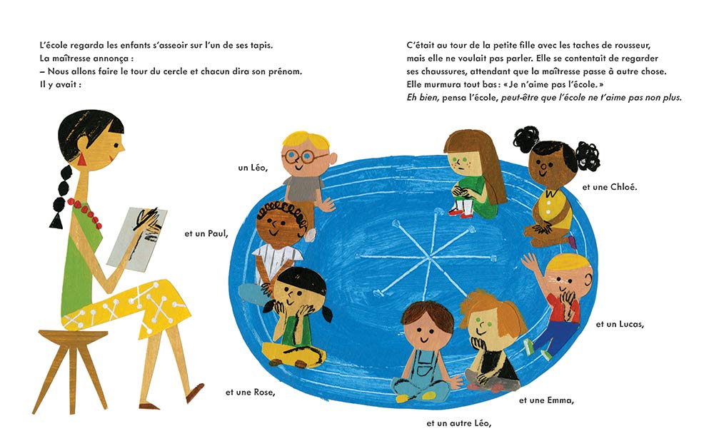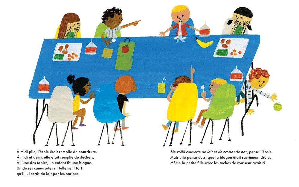 Autant dire que l’arrivée d’autant d’enfants est très angoissante et la première journée n’est clairement pas facile… Si certains enfants sont très à l’aise, d’autres n’aiment pas du tout l’école. Et cela lui fait beaucoup de mal. Finalement à la cantine, une blague en entrainant une autre, tout le monde finit par rire, y compris l’école elle-même. Plus tard, on apprend les couleurs, les formes, le dessin. A la fin de la journée, l’école retrouve le concierge, lui raconte tout et a hâte d’être à demain pour retrouver tout le monde.