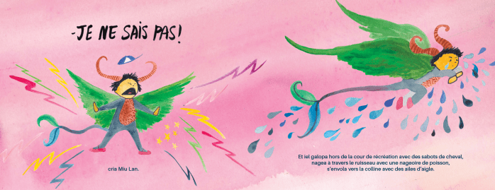 Dans cet instant magique entre nuit et jour, quand le soleil et la lune se partagent le ciel, naît un·e enfant. Miu Lan n’est pas comme les autres : iel peut se transformer au gré de ses envies et de son imagination. Au moment d’entrer à l’école, un défi se présente : garçon ou fille ? Oiseau ou poisson ? Fleur ou étoile filante ? Pourquoi faut-il choisir ? Enfant de fourrure, de plumes, d’écailles, de feuilles et de paillettes, Miu Lan trouve réconfort dans les bras de sa mère, qui lui offre ce refrain d’amour :