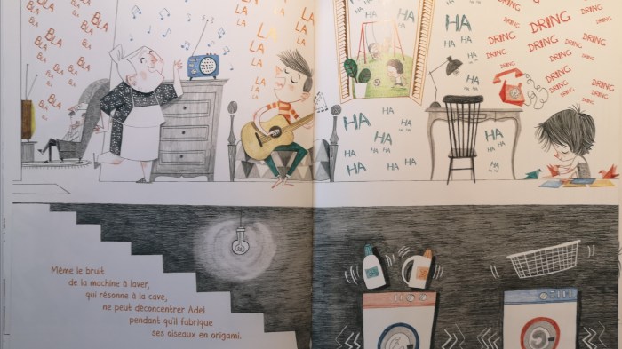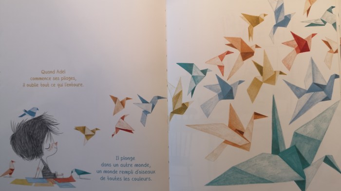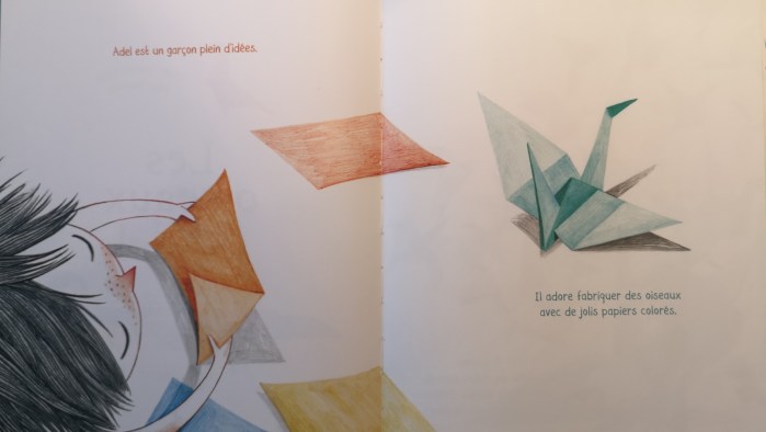Adel est un enfant plein d’idées. Il adore fabriquer des oiseaux avec de jolis papiers colorés. Quand il commence ses pliages, il oublie tout ce qui l’entoure, rien ne peut le perturber…Un album qui aborde le handicap d’une manière sensible et positive : chaque enfant a son propre talent.