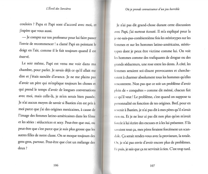 Voici un roman que j’aurais aimé lire il y a de cela 20 ans ! L’héroïne est une sorcière, une jeune fille métisse, grosse, élevée par deux papas, et bien que perçue de manière stéréotypée et discriminée par certains de ses camarades, elle les remet en place et s’adresse directement aux lecteurices pour déconstruire les agressions qu’elle subit.