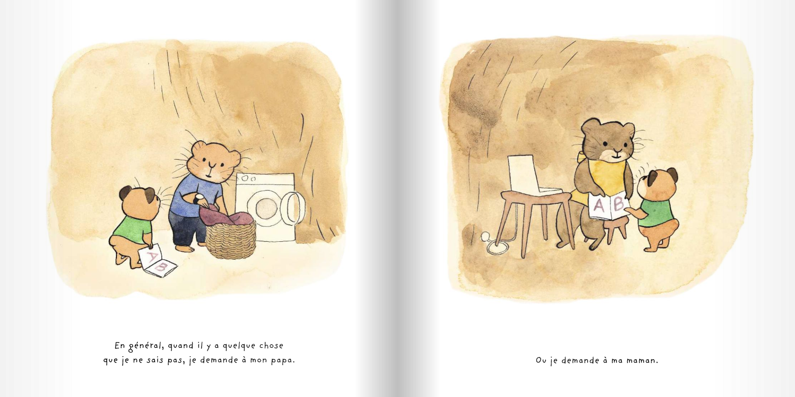 J’aime la curiosité de cet·te enfant (genré au masculin par quelques accords mais qui pourrait très bien être une fille), que l’auteur donne la parole aux enfants et à chacune de leur histoire, et qu’on voit son papa et sa maman en dehors des rôles basiques attribués. Ici, papa fait les lessives pendant que maman travaille sur son ordinateur, vient chercher son enfant à l’école, lit les histoires le soir et aborde même de lui-même les questions taboues !