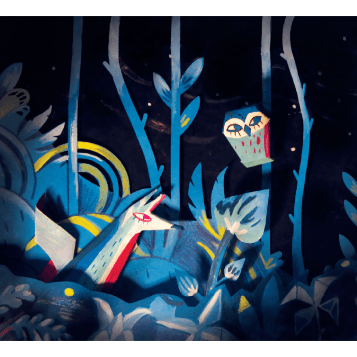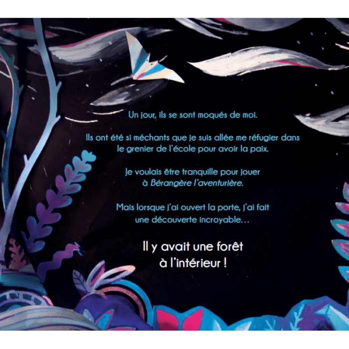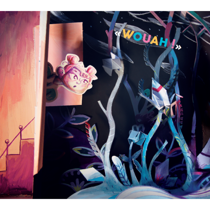 Les illustrations sont des photos de décors en papier peint et plié qui donnent un effet unique à ce livre. Cela m’avait beaucoup intrigué lorsque j’avais contribué à la campagne de financement, et le résultat est vraiment beau. Le rendu final donne une profondeur des décors véritablement étonnante et agréable. Je vous mets plus bas la vidéo de présentation du projet ulule dans laquelle l’autrice parle du projet et montrer sa manière de travailler.