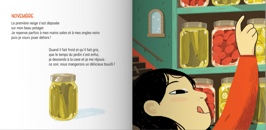 Un potager, c’est aussi beaucoup de travail et beaucoup de patience ! Pas toujours facile d’attendre mais ça vaut le coup… Chaque mois de l’année est rythmé par un double quatrain en rimes, c’est très sympathique à lire. Cela donne envie de se lancer dans son propre petit potager !