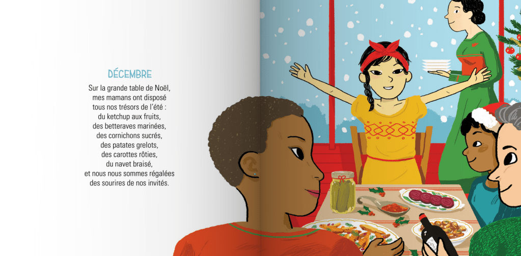 Les illustrations sont chouettes, colorées, très réalistes sur les fruits et légumes, et vous aurez remarqué que notre jeune jardinière porte des origines asiatiques, a deux mamans dont une blanche et une noire, ce qui pourrait nous amener à penser qu’elle est adoptée, sans que cela soit le sujet bien évidemment.