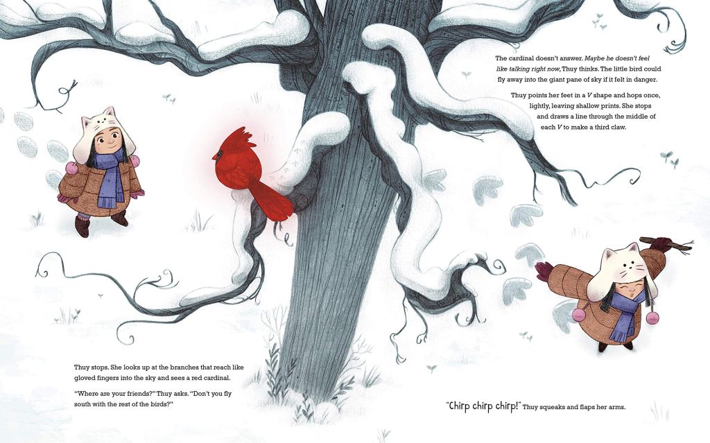 Every child feels different in some way, but Thuy feels double different. She is Vietnamese American and she has two moms. Thuy walks home one winter afternoon, angry and lonely after a bully’s taunts. Then a bird catches her attention and sets Thuy on an imaginary exploration. What if she could fly away like a bird? What if she could sprint like a deer, or roar like a bear? Mimicking the footprints of each creature in the snow, she makes her way home to the arms of her moms. Together, the three of them imagine beautiful and powerful creatures who always have courage – just like Thuy.