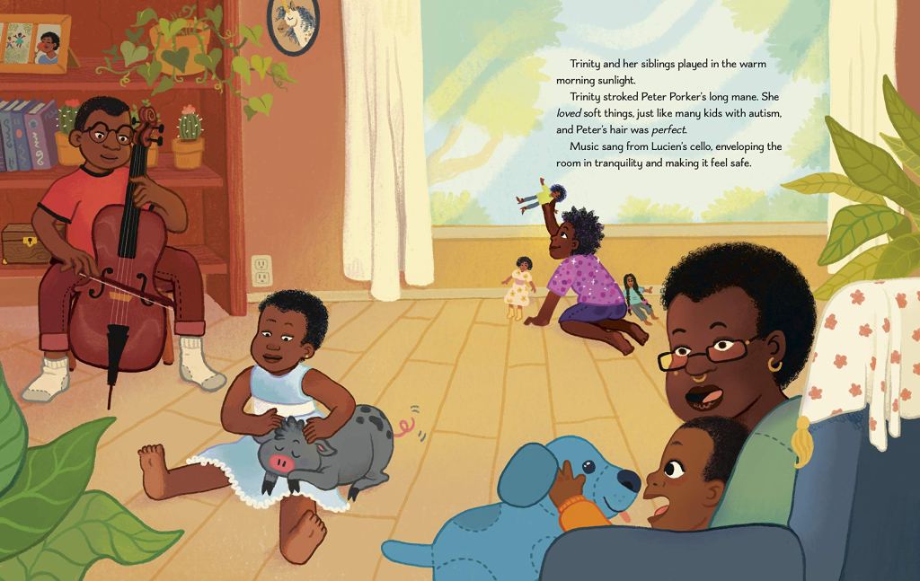 Trinity aime les choses douces, colorées, et du haut de son jeune âge, elle embrasse toutes ses identités en tant que jeune fille trans noire sur le spectre de l’autisme. En ce doux dimanche matin en famille, elle joue avec son adelphe Hypérion, puis avec sa poupée aux longs cheveux bouclés et à la carnation foncée magnifique.