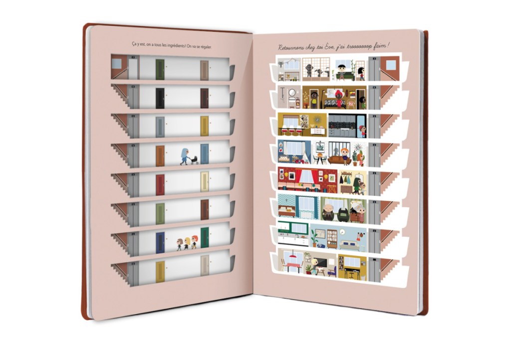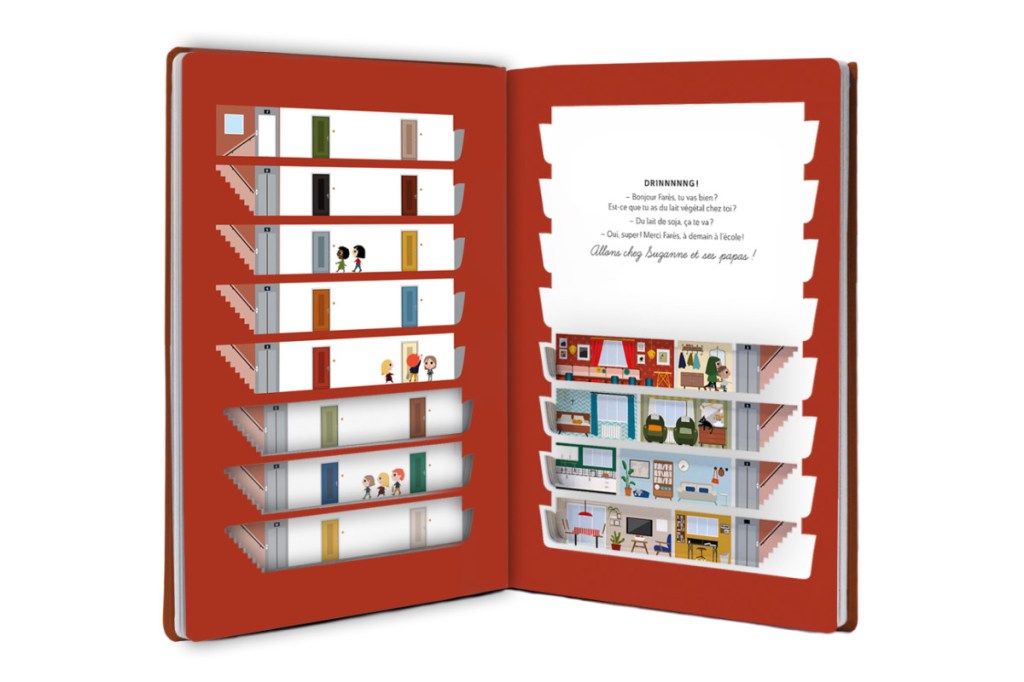 En une vingtaine de pages, on peut rencontrer un couple de personnes âgées, une famille de confession musulmane avec une maman voilée, une famille homoparentale avec 2 papas, une famille de confession juive, une famille d’origine africaine, une famille d’origine asiatique et, bien qu’on ne rentre pas dans leur appartement, on voit aussi un papa pousser son enfant en fauteuil roulant.