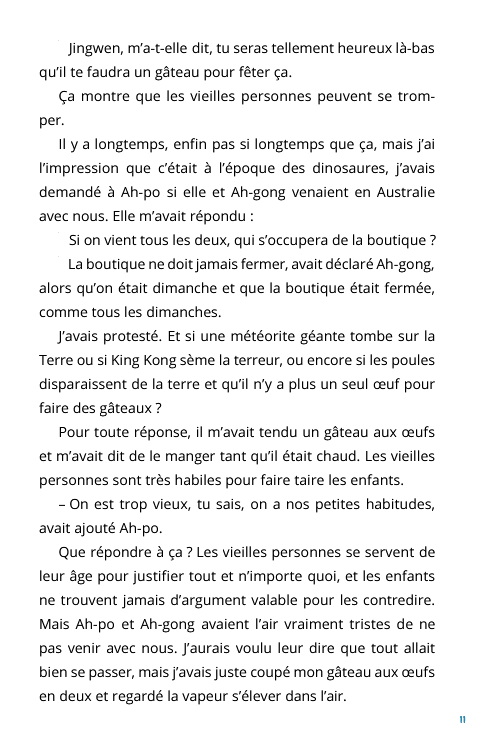 C’est ça le remède : la magie des gâteaux ! Jingwen et son frère partent alors en mission secrète pour réaliser l’ensemble des gâteaux prévus à la carte de Paradis Pâtisserie, la boutique de rêve de leur père. En mission secrète, car Jingwen non seulement s’interdit de parler de son père – cela pique son nez et rend triste sa mère, mais surtout car leur mère leur interdit de faire des gâteaux quand elle travaille. Vont-ils réussir ? Cela va-t-il l’aider à surmonter son deuil ? Jingwen finira-t-il par se sentir chez lui en Australie ?