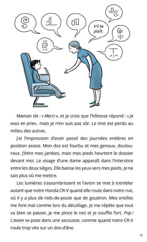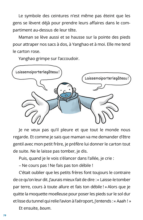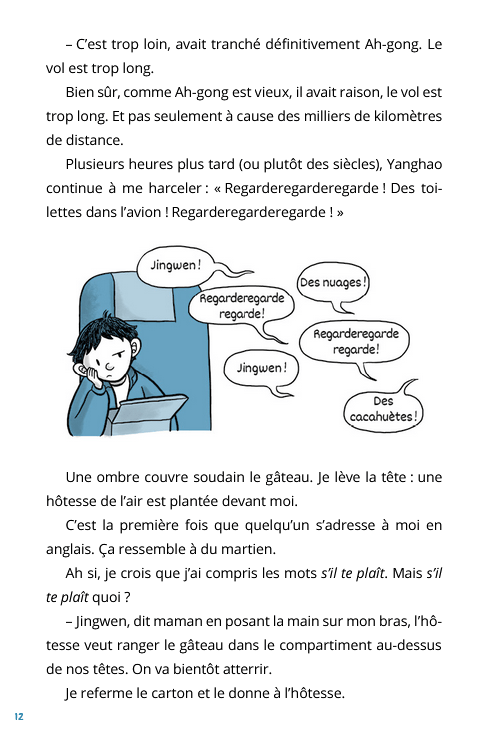 Ce roman jeunesse illustré est absolument à lire. Il traite avec parfois beaucoup de légèreté mais sans jamais faire de raccourci du deuil, de la culpabilité, des non-dits, mais aussi d’immigration et des difficultés vécues et ressenties, au sein d’une famille asiodescendante qui tente de se reconstruire. Jingwen, narrateur de 11 ans, est poignant et la sincérité du personnage est la clé de ce roman. Les illustrations qui ponctuent la lecture favorisent les moments d’humour et apportent cette légèreté de l’enfance.