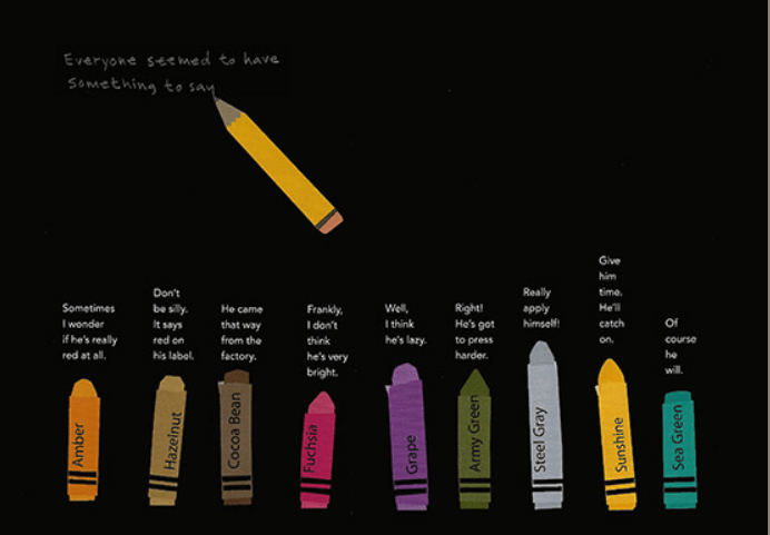On demande à ce crayon rouge, toujours connu comme étant rouge, de faire du rouge. Quoi de plus simple ? Pourtant, il n’y arrive pas et fait du bleu… Chacun y va de son petit commentaire : il n’est pas brillant, il est paresseux, il devrait faire comme ci, il devrait s’appliquer… La « bienveillance » des autres crayons, qui arrivent très bien à dessiner de la couleur qui leur est attribuée, les pousse à encourager ce crayon rouge et à vouloir lui venir en aide. Certains se demandent tout de même s’il est bien rouge ?