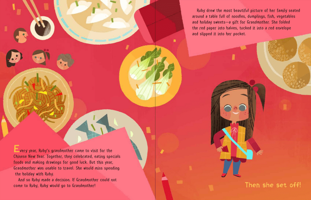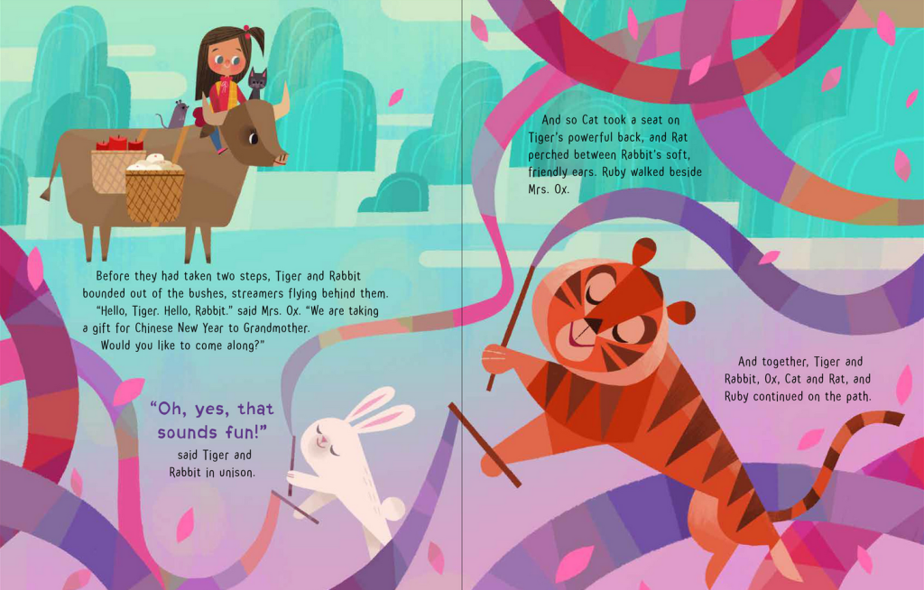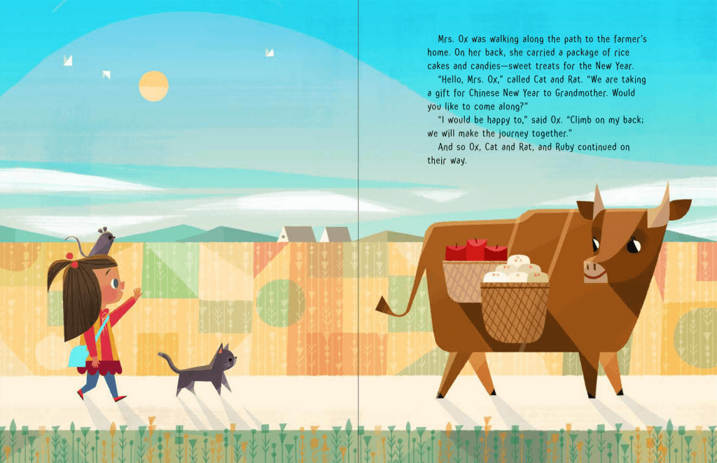 Alors que cette année la grand-mère de Ruby ne va pas pouvoir se joindre à elle et sa famille pour les festivités de la nouvelle année, Ruby décide de lui faire un dessin et d’apporter elle-même son cadeau. En chemin, elle va croiser Rat et Chat, grimper sur le dos de Buffle à côté des gâteaux de riz et autres friandises, continuer avec Tigre et Lapin dansant avec leurs rubans, accueillir la compagnie de Dragon et Serpent et de leurs lanternes, cueillir des fleurs avec Cheval et Chèvre, et rencontrer Singe et Coq en train de pêcher.