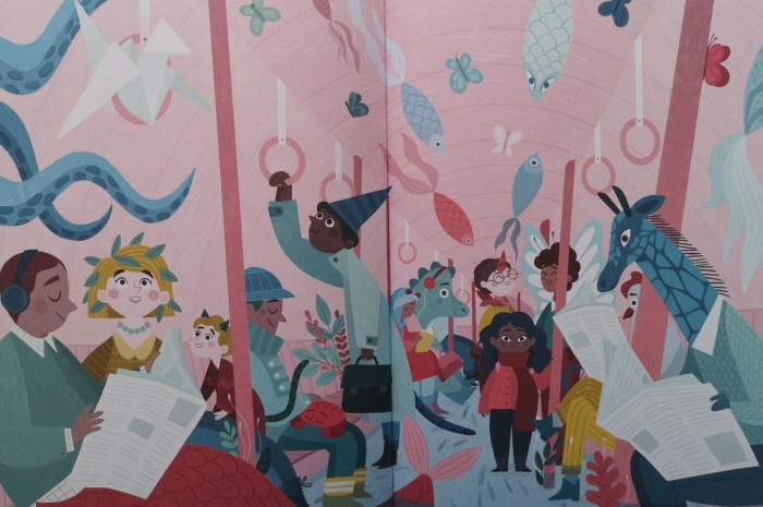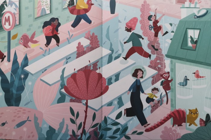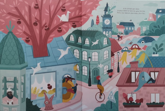 Mais sur le chemin de l’école, tout est encore possible : un·e fleuriste aidé·e par un poulpe, un arbre à religieuses, des oiseaux origamis, un chapeau nid d’oiseaux, un·e magicien·ne avec sa mallette, un passage piéton flottant, une souris qui promène son chat… Jusqu’à ce que les adultes de l’école nous rappellent à la réalité du temps !