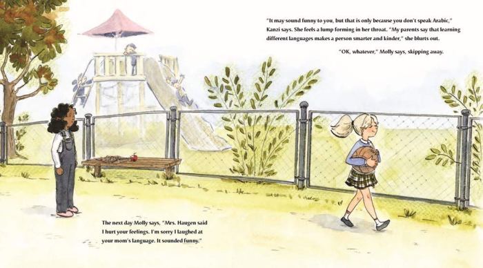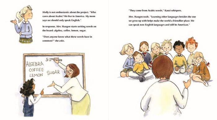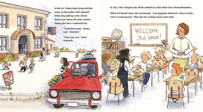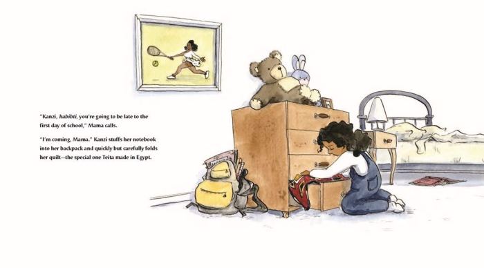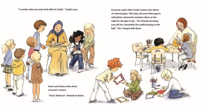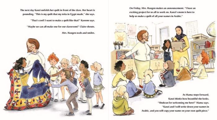 That night, Kanzi wraps herself in the beautiful Arabic quilt her teita (grandma) in Cairo gave her and writes a poem in Arabic about the quilt. Next day her teacher sees the poem and gets the entire class excited about creating a “quilt” (a paper collage) of student names in Arabic. In the end, Kanzi’s most treasured reminder of her old home provides a pathway for acceptance in her new one.