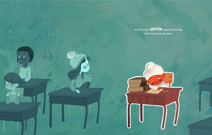 … jusqu’au jour où il engage finalement la conversation avec Abby, une camarade de classe qui a perdu son chapeau et qui va réussi à le faire rire. Finalement, les couleurs reviennent, rouge, rose, puis enfin jaune ! Et si avec la confiance, le blanc devenait la couleur pour jouer avec une amie ?