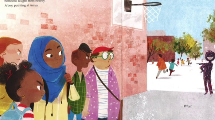 Mais… une fille à l’école demande à Faizah en chuchotant ce que porte sa soeur. Celle-ci répond en chuchotant mais ne comprend même pas pourquoi ce mimétisme. Elle réaffirme à haute voix que c’est un hijab. Plus tard, un garçon de l’âge d’Asiya se moque d’elle. Son groupe d’ami·e·s (merveilleusement composé) n’apprécie pas et change d’espace. Finalement, cette même petite fille va apprécier le dessin de Faizah : deux soeurs portant un hijab bleu, pique-niquant sur une île là où l’océan et le ciel se touche. Et malgré tout, ce garçon malveillant n’aura pas gâché la journée d’Asiya.